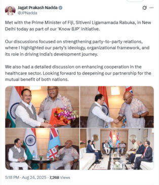 जेपी नड्डा ने इस मुलाकात को लेकर सोशल मीडिया प्लेटफॉर्म एक्स पर जानकारी साझा की और कहा कि आज नई दिल्ली में फिजी के प्रधानमंत्री सिटिवेनी लिगामामादा राबुका से ‘भाजपा को जानें’ पहल के अंतर्गत भेंट हुई। यह मुलाकात पार्टी-स्तरीय संबंधों को सुदृढ़ करने पर केंद्रित रही। इस दौरान मैंने भारतीय जनता पार्टी की विचारधारा, संगठनात्मक संरचना और भारत के विकास में पार्टी की भूमिका के बारे में विस्तार से जानकारी साझा की। स्वास्थ्य सेवा क्षेत्र में सहयोग बढ़ाने को लेकर भी व्यापक चर्चा हुई। हमें विश्वास है कि दोनों देशों के आपसी हित में यह साझेदारी और मजबूत होगी।