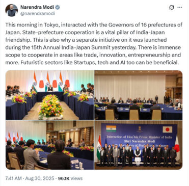 प्रधानमंत्री मोदी ने इस मुलाकात की तस्वीरें सोशल मीडिया प्लेटफॉर्म ‘एक्स’ पर साझा करते हुए लिखा, “आज सुबह टोक्यो में जापान के 16 प्रान्तों के राज्यपालों से बातचीत की। राज्य-प्रान्त सहयोग, भारत-जापान मैत्री का एक महत्वपूर्ण स्तंभ है।”