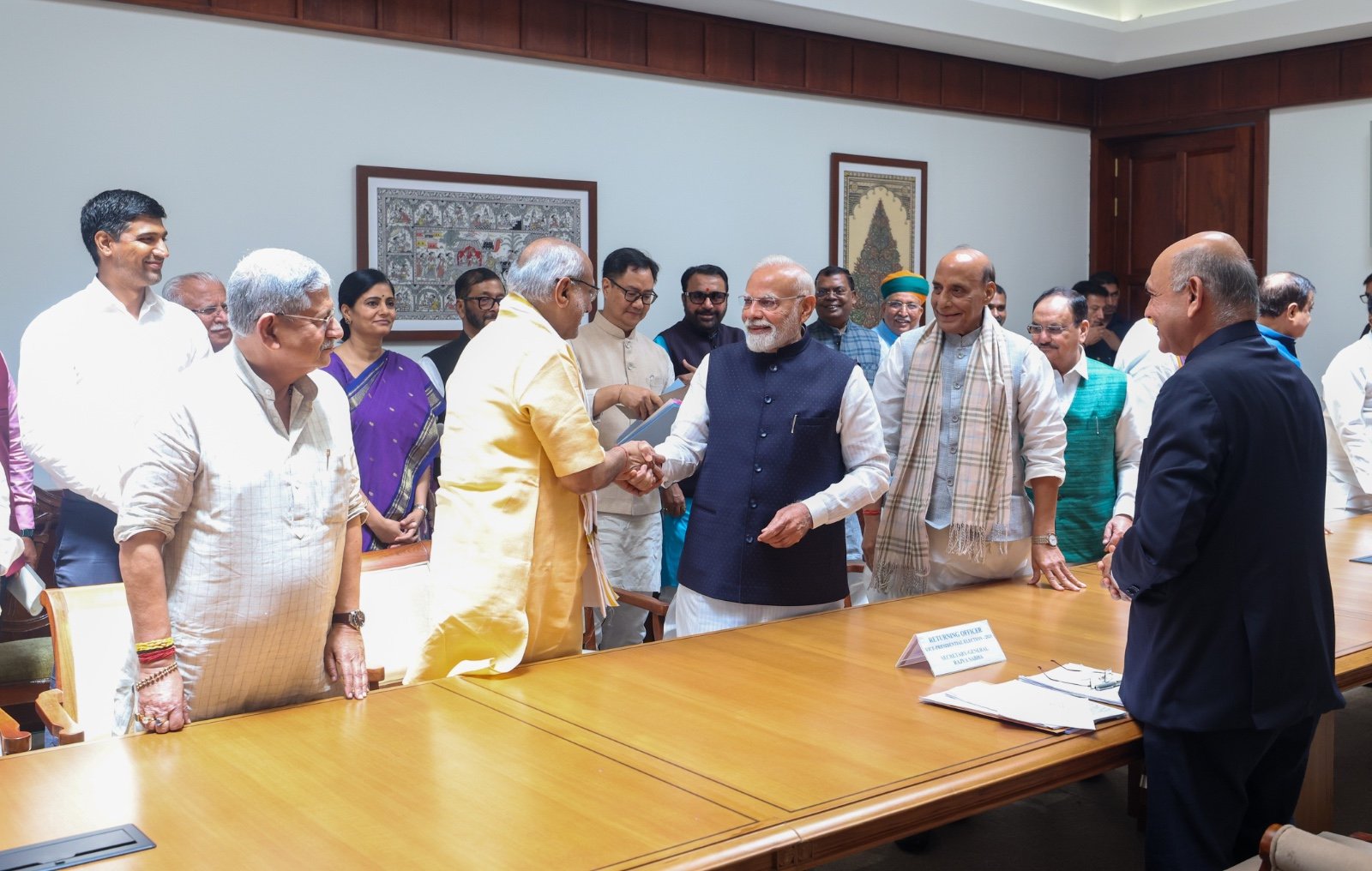 Delhi: राष्ट्रीय जनतांत्रिक गठबंधन-एनडीए के उप-राष्ट्रपति पद के उम्मीदवार सी पी राधाकृष्णन ने संसद भवन में अपना नामांकन दाखिल किया। इस अवसर पर प्रधानमंत्री नरेन्द्र मोदी, केन्दीय मंत्री अमित शाह, राजनाथ सिंह, जे पी नड्डा, किरेन रिजिजू तथा लोक जनशक्ति पार्टी (रामविलास) के चिराग पासवान, जनता दल युनाइटेड के राजीव रंजन सिंह, राष्ट्रवादी कांगेस पार्टी के प्रफुल्ल पटेल सहित एनडीए गठबंधन के नेता उपस्थित थे। नामांकन दाखिल करने से पहले सी पी राधाकृष्णन ने संसद भवन परिसर में प्रेरणा स्थल पर पुष्पांजिल अर्पित की। इस स्थल पर देश के प्रमुख…
